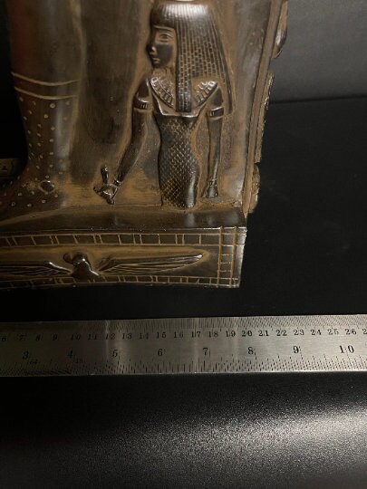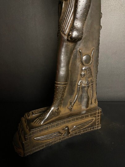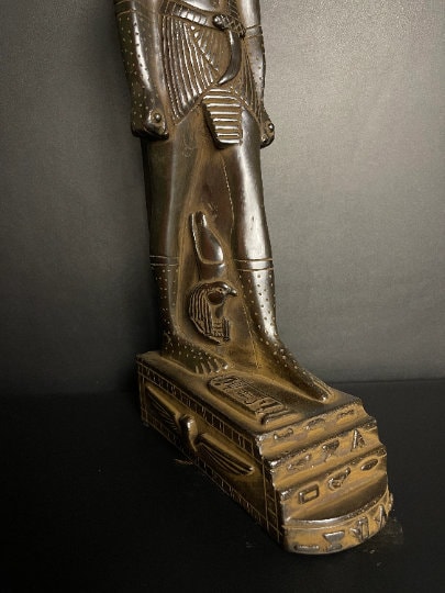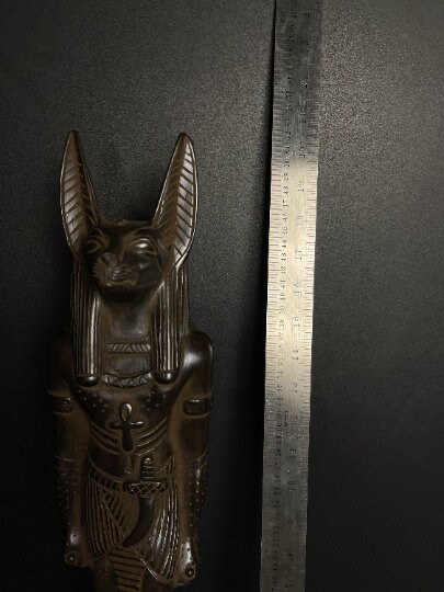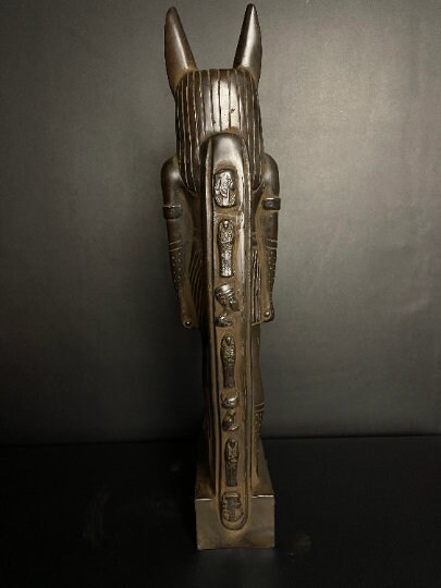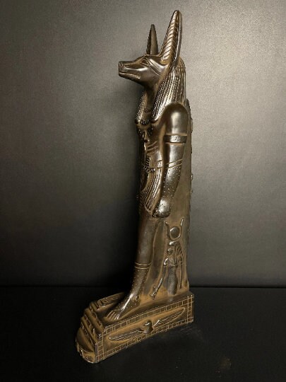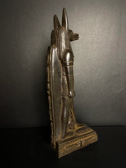 Marvelous Statue of Anubis The Jackal God of Afterlife in Ancient Egypt. standing , Handmade in Egypt from Heavy basalt Stone. On the base a story there are finely hand carved of The protection wings and Hathor goddess wearing the sun disk and between his Legs Horus god of the sky wearing the Double crown of Egypt and the Egyptian Hieroglyphs telling a lot about Anubis, special made for you 😉