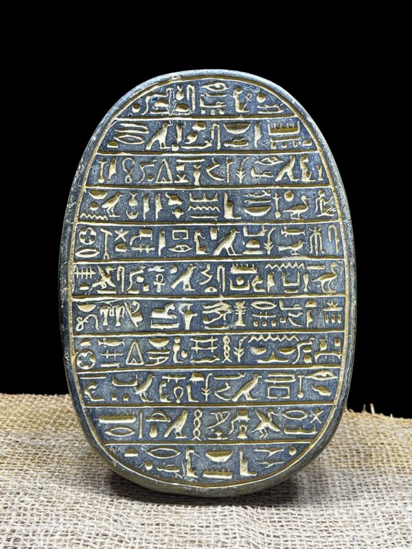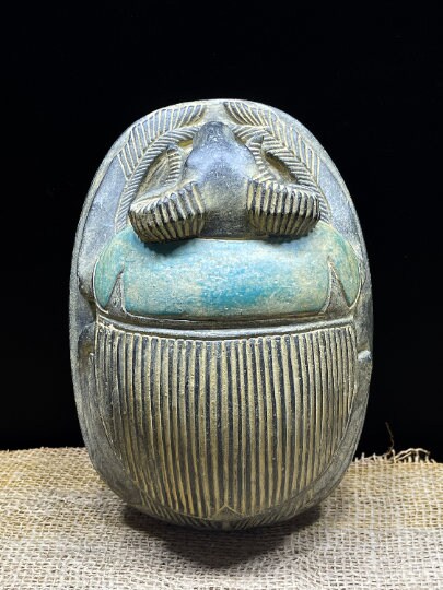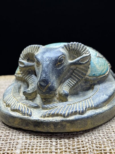 Ancient Egyptian scarab ( Symbol of good luck ) with God Khanum ( Khnum ) head representing fertility wit the Egyptian hieroglyphs on the back, made from limestone, 100% Hand-carved!, made by Egyptian hands!
