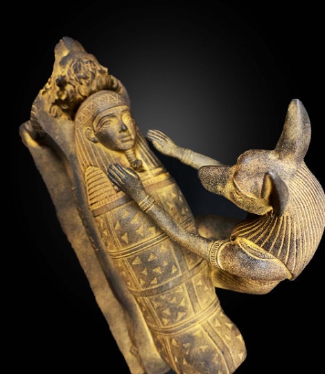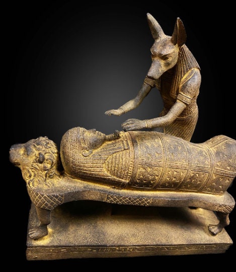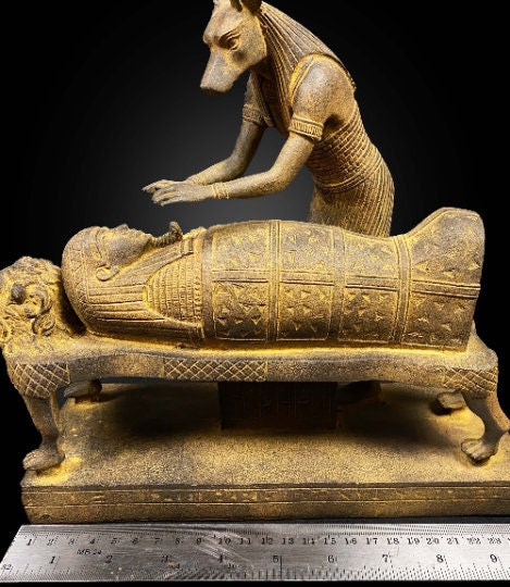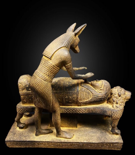 in a perfect scene doctor Anubis the jackal god of mummification and afterlife mummify King Tutankhamun after death, Hand made antique made from basalt stone with amazing hand carving and beautiful old touching like the original one, specially made for you 😉