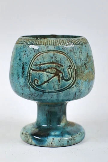 Enthralling Vintage Ancient Egyptian Cup – Eye of Horus carving – Handmade of flame stone with marvelous glaze touching in Egypt