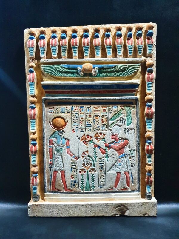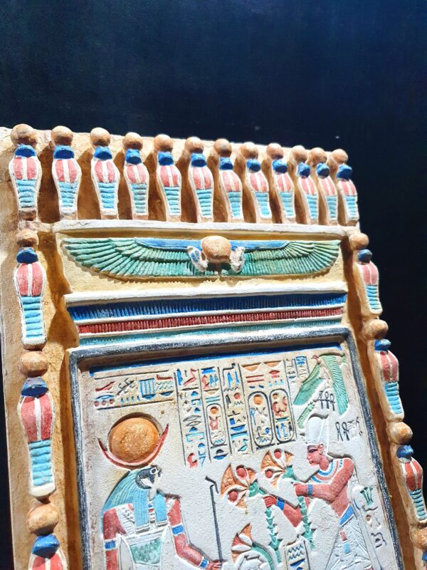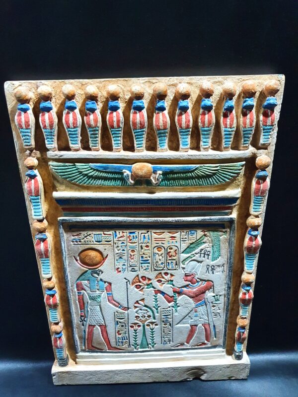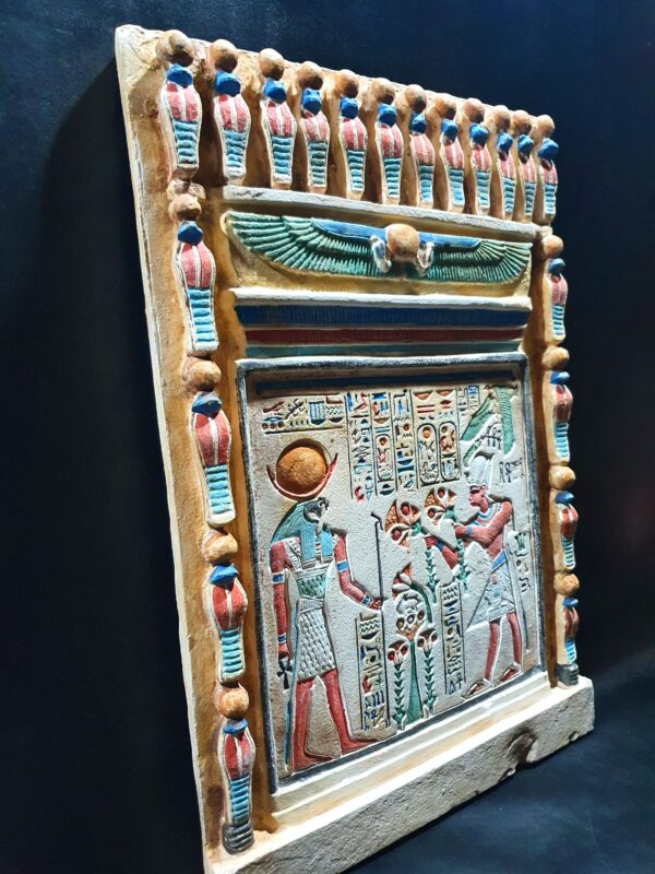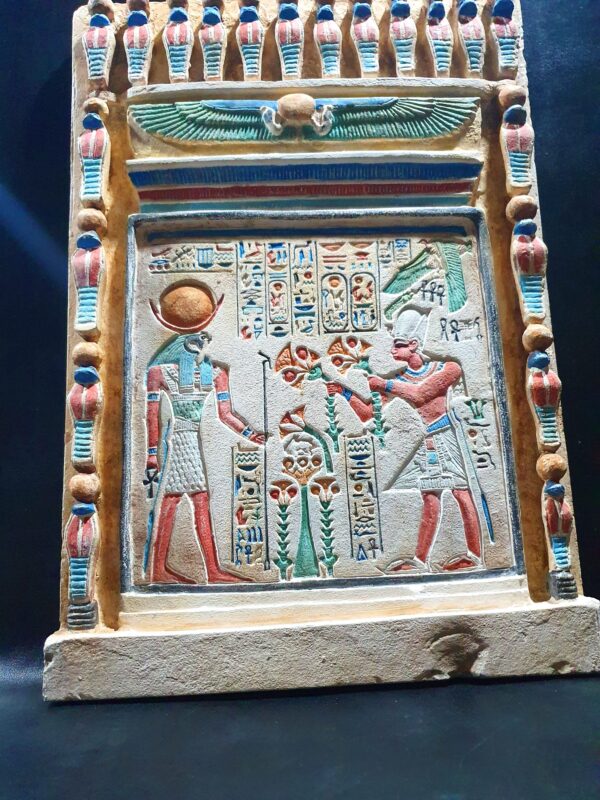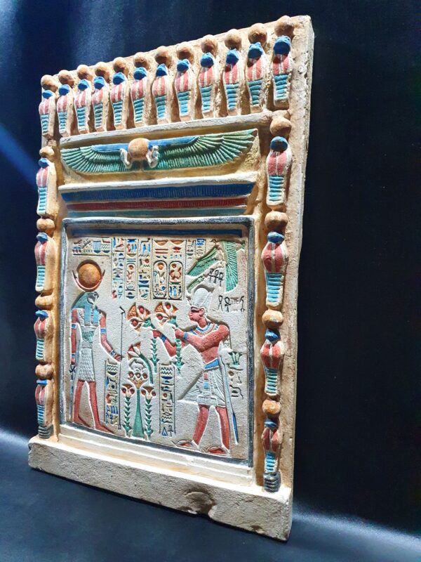 This is a tablet contains sculptures of The well-known battle of Gods, Amun-Ra and Ramsees the second, its the exact replica from the Amun-Ra Temple (Precinct of Amun-Re), you can see Ramsees ii handing over lotus flowers to Amun-Ra and the sun with wings around it watching them, its colors are mesmerizing and is carefully made to be the exact replica of the real one.