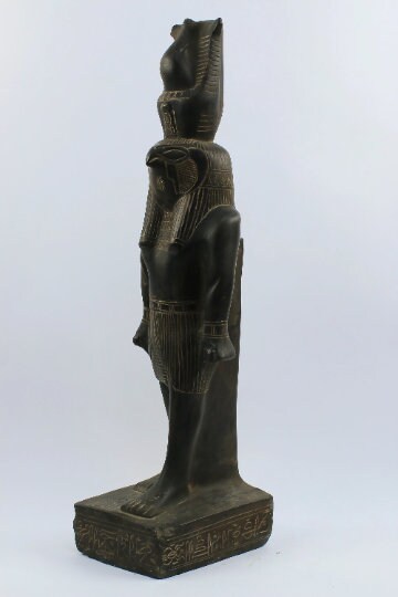 This is a Statue Horus the god of life and sky wearing the crown that he made when he united upper and lower Egypt, with a unique carving at the back with the ancient Egyptian language, this statue is made from basalt stone and it is the exact replica, it has beautiful color and it’s carefully made for you to give a lovely taste to your collection.