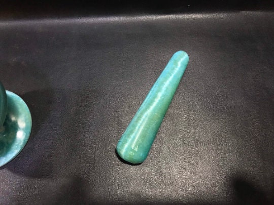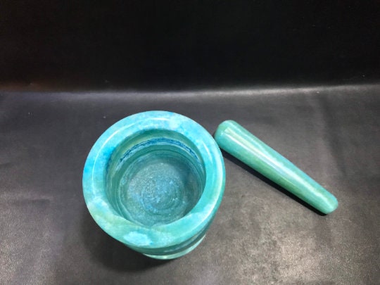 This is an ancient egyptian pestle and mortar, perfectly handmade from natural turquoise alabaster stone with marvelous natural whitish veins in egypt.