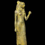 Sekhmet whose name means: “She who is powerful” or “the One who loves Ma’at” was the goddess of the hot desert sun, plague, chaos, war, and healing. She was created from the fire of the sun god Ra’s eye when he looked upon Earth. Ra created her as a weapon to destroy humans for their disobedience to him and for not living in accordance with the principles of Ma’atX
