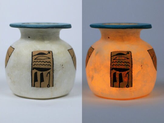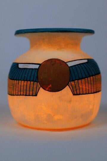 This is a Vase specially made from the spiritual stone ALABASTER- You can use it as a candle holder, or for flowers, it fits at your home perfectly giving it a beautiful taste, also it gives massive positive energy by lighting a candle inside it while spreading this positive energy it gives a warm light to the room to make you feel at peace and relaxed, this item is specially made for you with these beautiful colors, giving it a taste of the ancient Egyptian culture.