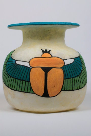 This is a white alabaster vase, handmade from Egypt with paintings on both sides of the vase.