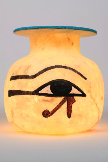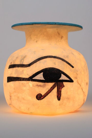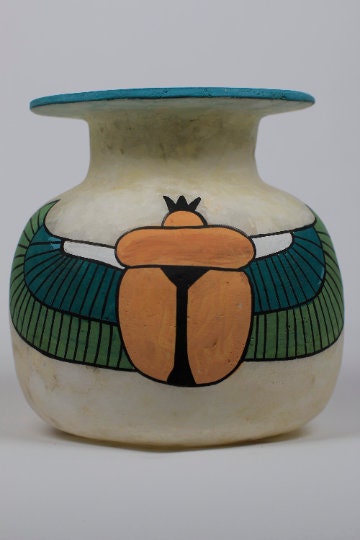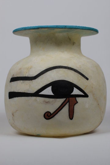 Perplexing White ALABASTER Vase – Double-sided Painting (Eye of Ra – Winged Scarab) – Used for Spiritualism – Handmade in Egypt