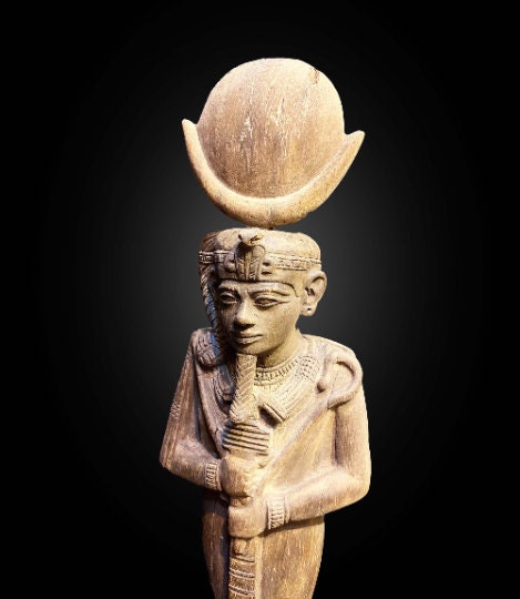 your Unique large statue of Khensu god of the moon and time wearing the sun disk and Holding the stick like the original one, handmade from Wood with the marvelous removable Sun disk and with the perfect Egyptian hand carving, specially made for the lovers of Khensu 😉