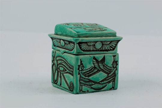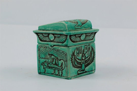 A real lime stone is finely carved into Canopic Jars Inside A Box with marvelous details as you can see on the top of the cover The Wadjet (Eye of Horus) With ISIS kneeling and spreading her protective wings. On the the side Maat the goddess of justice & harmony with ISIS. On the other side the Wadjet symbol of protection and royal power. While the other side there’s the famous sculpture of Anubis mummifying King Tutankhamun. While Amun’s sun disk is on the back of the box’s cover.