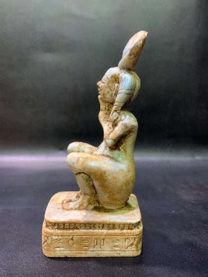 your unique antique of Khonsu god of the moon and time sitting and wearing the sun disk (symbol of Hathor) , made from Flame stone with the perfect Handmade, specially made for you 😉