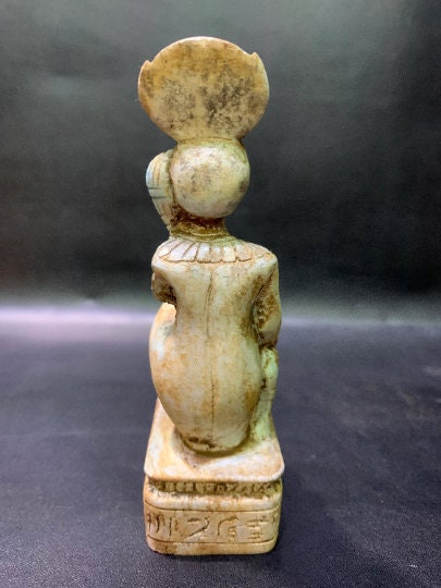 Unique Egyptian Khonsu The God of Moon & Time sitting and wearing the sun disk of Hathor- Altar statue made from Flame stone -made in Egypt